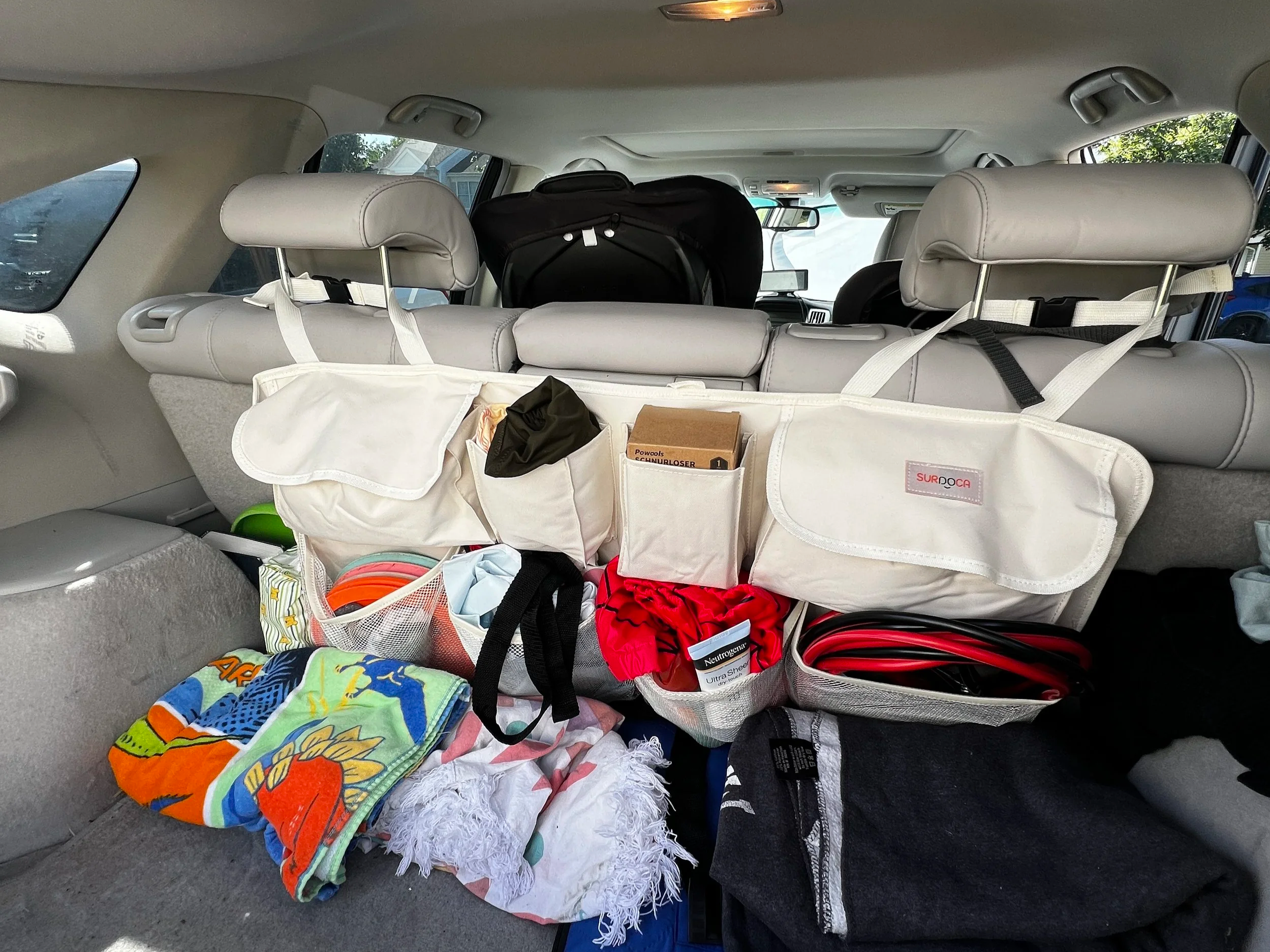 Raincoats/Sweaters for the Kids: When we're out and about, places can be colder than I thought when getting ready for the day. I like to keep a light jacket for each child in the car, and this organizer is the perfect place to store them.